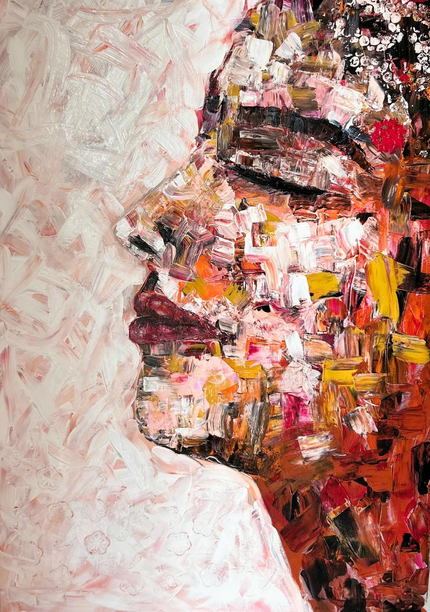 This piece, "Fragments of the Soul," is a mesmerizing study of identity rendered through the lens of abstraction. The artist employs a vigorous impasto technique using a palette knife, creating a surface rich with sculptural texture. The right side of the face is constructed from a vibrant mosaic of warm colors—fiery reds, yellows, and deep oranges—suggesting passion, memory, and experience.In stark contrast, the left side of the canvas is dominated by soft, swirling strokes of pure white, symbolizing clarity, silence, or the unwritten future. This duality is central to the work: the fragmentation of the self into myriad emotional pieces, yet their ultimate coherence into a luminous whole. Each thickly applied block of color is a tiny window into a different aspect of the subject's inner life, inviting the viewer to piece together the narrative of the 'soul' from its constituent fragments.